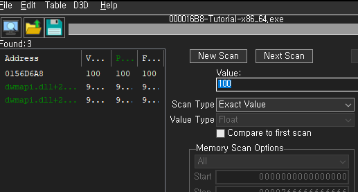 여기서 위 사진과 같이 바꾸어 준 후 현재의 Health 값인 100을 검색해보도록 하겠습니다.