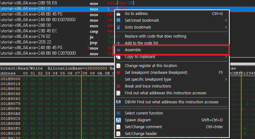 버튼을 클릭하면 위와같이 어떤 어셈블리 코드가 이 메모리 주소에 쓰기 된건지 볼 수 있습니다.