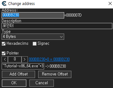 그럼 아래 사진처럼 원래 주소와 오프셋을 적용한 포인터의 Value값이 같다는것을 알 수 있습니다.