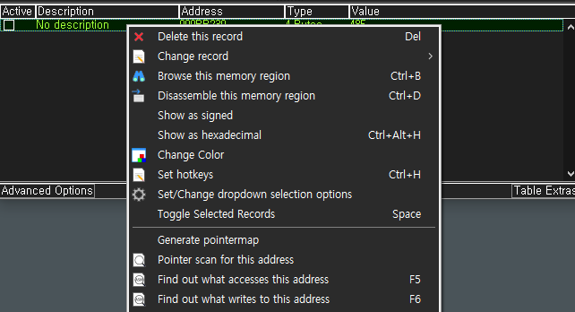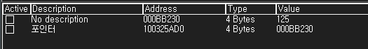 여기서 초록색으로 검색된 결과 한개가 나왔는데, 치트엔진에서 초록색으로 검색되는 값은 모두 포인터를 나타냅니다.