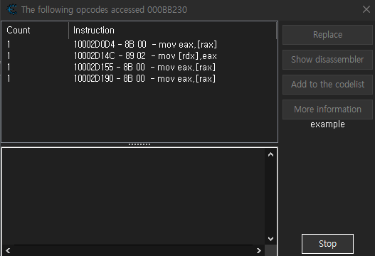 이 창에서는 주소에서 어떤 것이 접근이 되는지 모든 접근에 대한 어셈블리를 띄워줍니다.